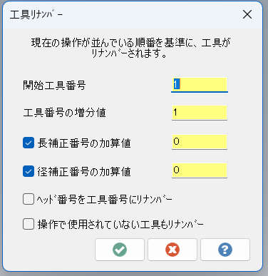 工具リナンバーを使うと後から工具番号(T番号)を変更することができます。工具番号のみの変更なのでツールパスの再生成は必要ありません。